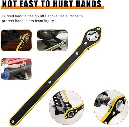 This wrench is designed with an extended handle that measures 13.5 inches in length. It is longer than a regular wrench and allows for good leverage, which is both strong and labor-saving. With it, even girls with little strength will be able to use the jack with ease.