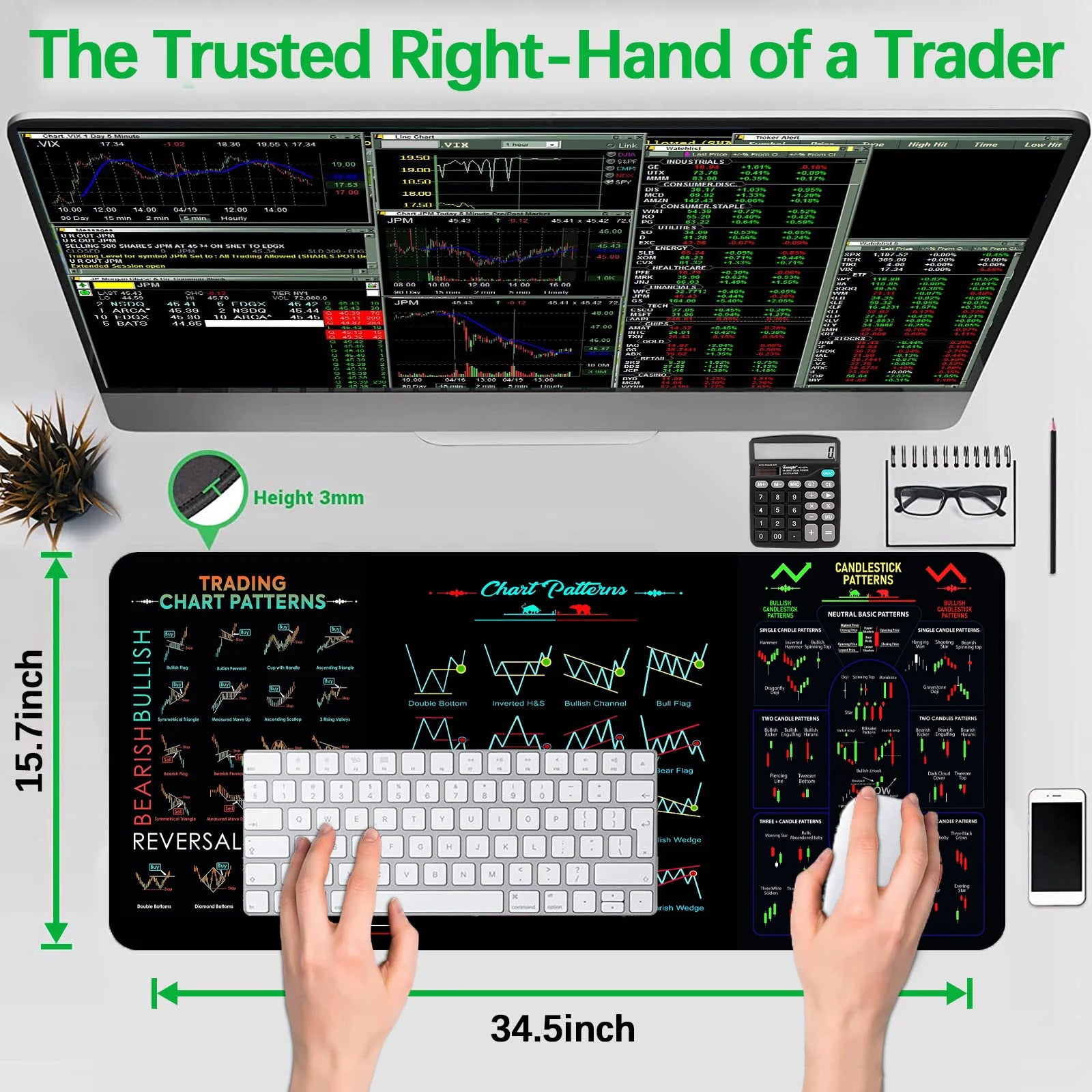 The mat is designed with a non-slip base to keep it firmly in place on your desk, preventing any unwanted movement while you're working or trading. You can focus on your trades without worrying about your mat shifting.